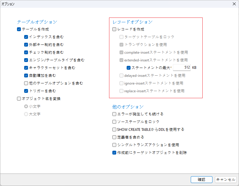 オプションをクリックし、レコードオプションでレコードを作成のチェックを外します。