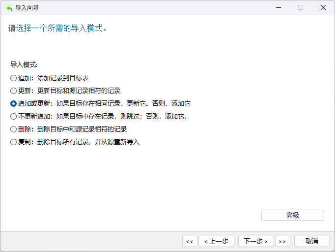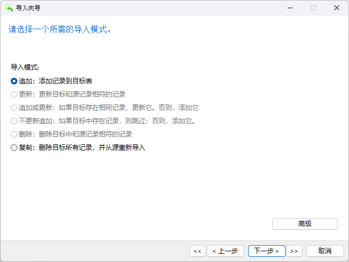 为了在导入向导的这个步骤激活余下的选项,你必需在上一个步骤启用主键。Navicat 需要主键来找出要进行删除或更新动作的记录。