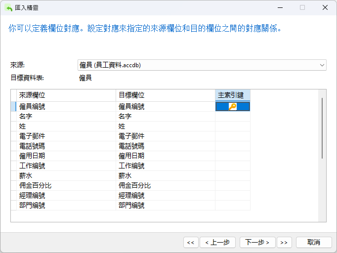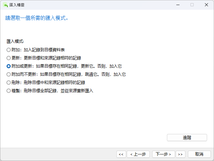 為了在匯入精靈的這個步驟激活餘下的選項,你必需在上一個步驟啟用主索引鍵。Navicat 需要主索引鍵來找出要進行刪除或更新動作的記錄。